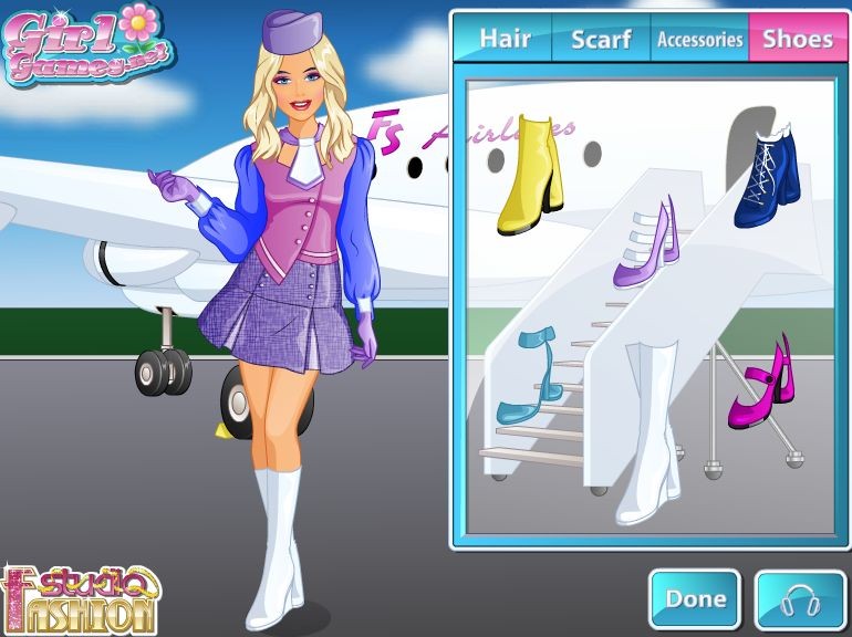 Życie stewardessy wcale nie jest takie proste. Pomimo tego zwiedzi cały świat samolotem a na dodatek będzie szykownie prezentować się w swoim firmowym stroju. Skomponuj strój według własnych upodobań. Dużo opcji do wyboru!